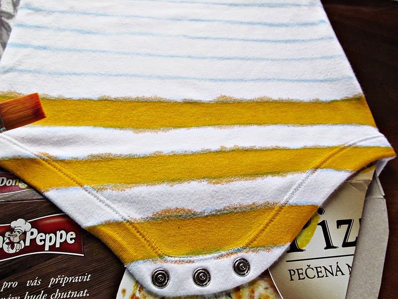 Takže začneme tělíčkem. Pokud budete mít více štěstí než já a nejdete někde již pruhované body, rozhodně ho kupte a ušetříte si nejvíc práce ;) Dokonce i když si koupíte jen černo-bílé, budete to mít jednoduché. Bohužel já žádné nesehnala, takže jsem se do toho musela dát od píky. Pěkně bílé body, barvy na textil, křída, metr a štětce. To vše potřebujete k tomu, abyste si z bílého body udělali pruhované.
